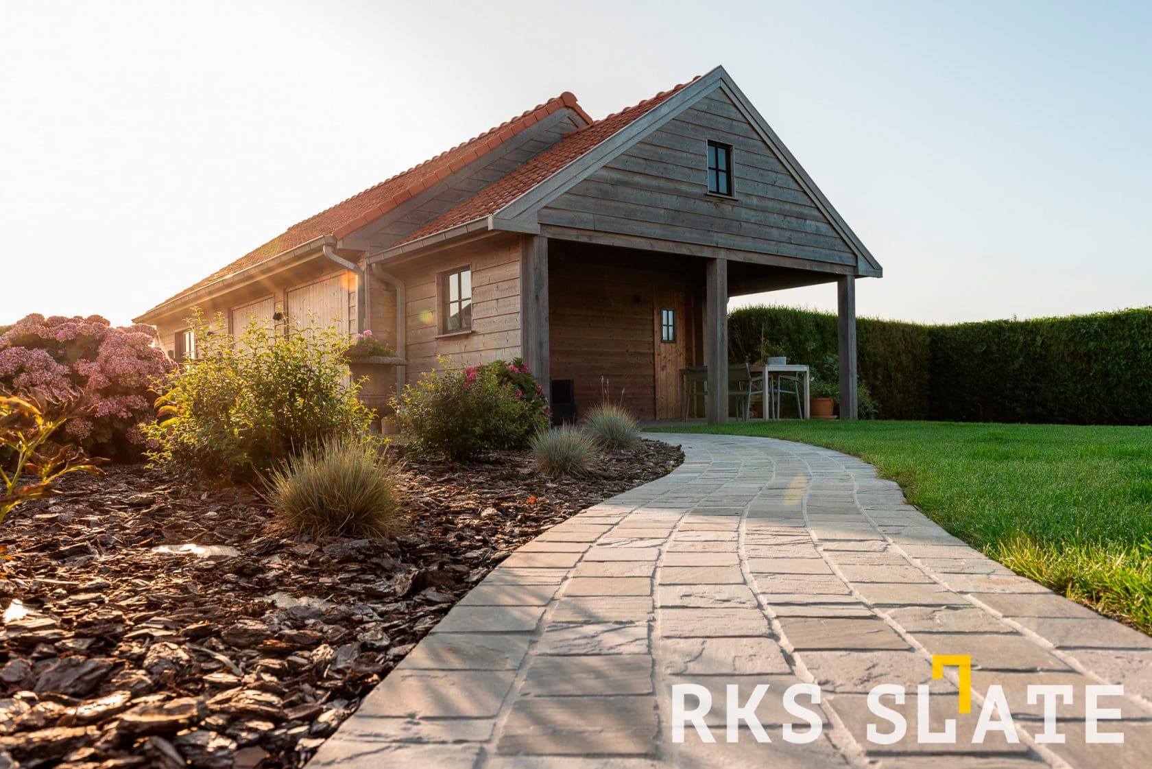 - Выразительность и природная текстура — колотые бока придают мощению выразительность, что особенно актуально при создании классических мощёных дорожек и площадей.